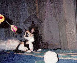 | Maggie lounging on the couch after a hard session of playing feather. | ![]() |